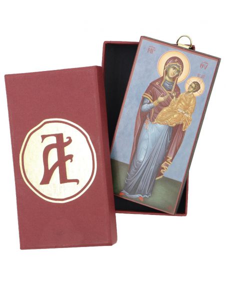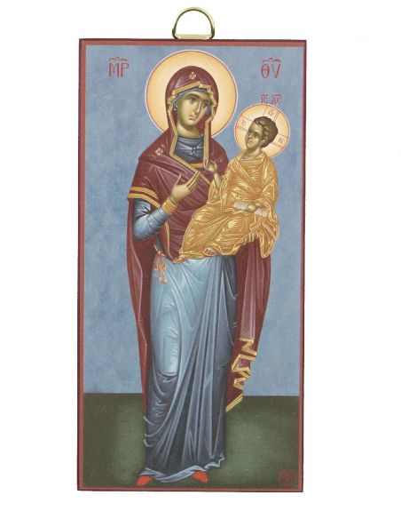Η Μητέρα του Θεού ή Θεοτόκος κατέστη το κύριο πρόσωπο μετά τον Τριαδικό Θεό, που συνέβαλε ουσιαστικά στην υλοποίηση του σχεδίου της σωτηρίας του ανθρώπινου γένους. Η Παναγία εικονίζεται ολόσωμη και Βρεφοκρατούσα. Εικονογραφικά, η παράσταση ταυτίζεται με την Οδηγήτρια, καθώς το πάγιο χαρακτηριστικό αυτού του τύπου είναι η θέση του δεξιού χεριού της μπροστά στο στήθος. Η Παναγία κρατεί τον Χριστό στο αριστερό της χέρι, γέρνει ελαφρά το κεφάλι προς το Παιδί και φέρει το δεξί της χέρι μπροστά στο στήθος με δέηση. Ο Χριστός κάθεται με όρθιο κορμό, κρατεί κλειστό ειλητάριο στο αριστερό του χέρι, ενώ με το δεξί ευλογεί.