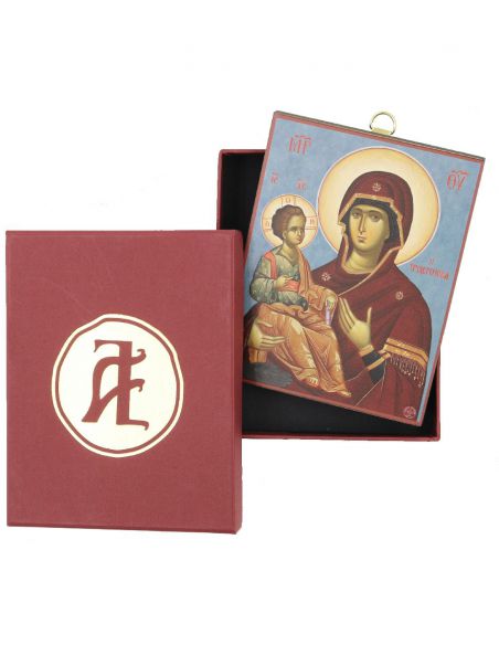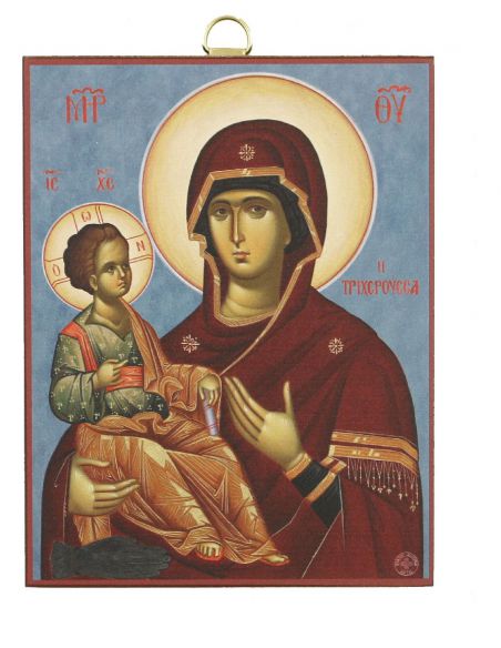 Πρόκειται για ακριβές αντίγραφο της εικόνας της Παναγίας της Τριχερούσας, η οποία βρίσκεται στην Ιερά Μονή Χιλανδρίου στο Άγιον Όρος. Η θαυματουργός εικόνα αποτελούσε οικογενειακό κειμήλιο του Αγίου Ιωάννη του Δαμασκηνού. Ο Άγιος Ιωάννης, ο οποίος ήταν πρωτοσύμβουλος στη Δαμασκό, συκοφαντήθηκε από τον εικονομάχο Λέων Γ' τον Ίσαυρο στον χαλίφη ως προδότης, και τιμωρήθηκε με την αποκοπή του δεξιού του χεριού. Ο άγιος όλη τη νύχτα ικέτευε την Παναγία να τον θεραπεύσει προκειμένου να συνεχίσει τον σκληρό αγώνα του υπέρ της Ορθοδοξίας. Κατάκοπος, όπως ήταν, είδε σε όραμα την Παναγία να του λέει, ότι θεραπεύτηκε. Από τη ευγνωμοσύνη, του κατασκεύασε ένα αργυρό ομοίωμα του χεριού του και το τοποθέτησε κάτω από το αριστερό μέρος της Εικόνας της Παναγίας. Ένεκα τούτου του περιστατικού ονομάστηκε η Εικόνα της Παναγίας της Τριχερούσας. Ο άγιος Σάββας, ο πρώτος αρχιεπίσκοπος της Σερβίας και κτήτορας της Μονής Χιλανδαρίου μετέφερε την εικόνα στη Μονή, ως ευλογία στην ορθόδοξη πατρίδα του.