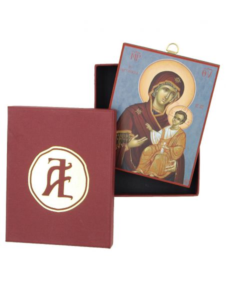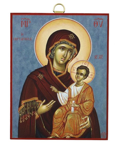 Πρόκειται για ακριβές αντίγραφο της εικόνας της Παναγίας της Πορταΐτισσας, η οποία βρίσκεται στην Ιερά Μονή Ιβήρων στο Άγιον Όρος. Είναι, κατά παράδοση, έργο του Ευαγγελιστή Λουκά. Η εικόνα άνηκε σε μία ενάρετη χήρα, η οποία για να σώσει την εικόνα από τα χέρια των εικονομάχων, την έριξε στη θάλασσα. Κατά θαυμαστό τρόπο, η εικόνα στάθηκε όρθια και έπλεε προς το Άγιον Όρος. Μία μέρα, οι γέροντες της μονής Ιβήρων, είδαν μέσα στη θάλασσα μία εικόνα της Θεοτόκου, την οποία, όσο πλησίαζαν τόσο αυτή απομακρυνόταν. Μοναχά ο Όσιος Γαβριήλ, με εντολή της Παναγίας, περπάτησε στη θάλασσα κι αμέσως η εικόνα ήρθε στην αγκαλιά του. Στην αρχή, τοποθέτησαν την εικόνα στο ναό της Μονής, αλλά εκείνη έφευγε και στεκόταν πάνω από την πύλη του Μοναστηριού. Αυτό συνέβη πολλές φορές, ώσπου ξαναπαρουσιάστηκε η Παναγία στον Γέροντα Γαβριήλ και του είπε να πάψουν να την πειράζουν, διότι δεν ήρθε στο Μοναστήρι για να τη φυλάνε αυτοί, αλλά για να γίνει αυτή φύλακας και φρουρός τους. Έκτοτε, η εικόνα είναι τοποθετημένη στο παρεκκλήσιο της μονής Ιβήρων που βρίσκεται αριστερά της κεντρικής πύλης. Ως εκ τούτου, της δόθηκε και το προσωνύμιο της Πορταΐτισσας.