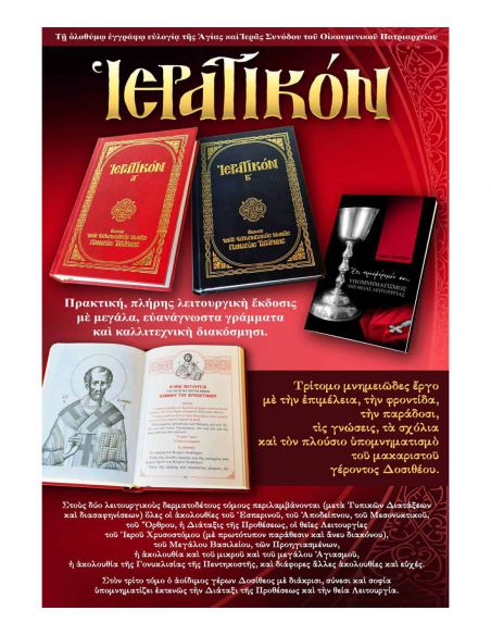 Πρακτική, πλήρης λειτουργική έκδοσις με μεγάλα, ευανάγνωστα γράμματα και καλλιτεχνική διακόσμησι.